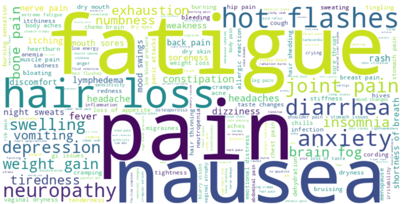 While a doctor’s chart may list side effects, the subreddit provides the raw, human experience behind them. Our analysis of the side effects data revealed over 4,300 unique terms used to describe the impact of treatment. The top 50 terms paint a vivid picture of the physical and emotional toll.