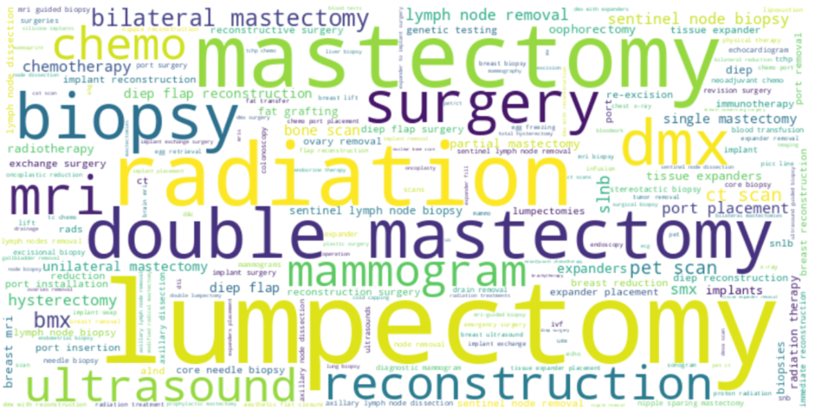 Similarly, the word cloud for procedures highlights the centrality of surgical intervention. Words like lumpectomy, mastectomy, and radiation dominate, each representing a monumental step in the patient journey. The prevalence of terms like biopsy and reconstruction shows that the community is a place where people discuss the entire process, from the first steps of diagnosis to the final stages of recovery and rebuilding.