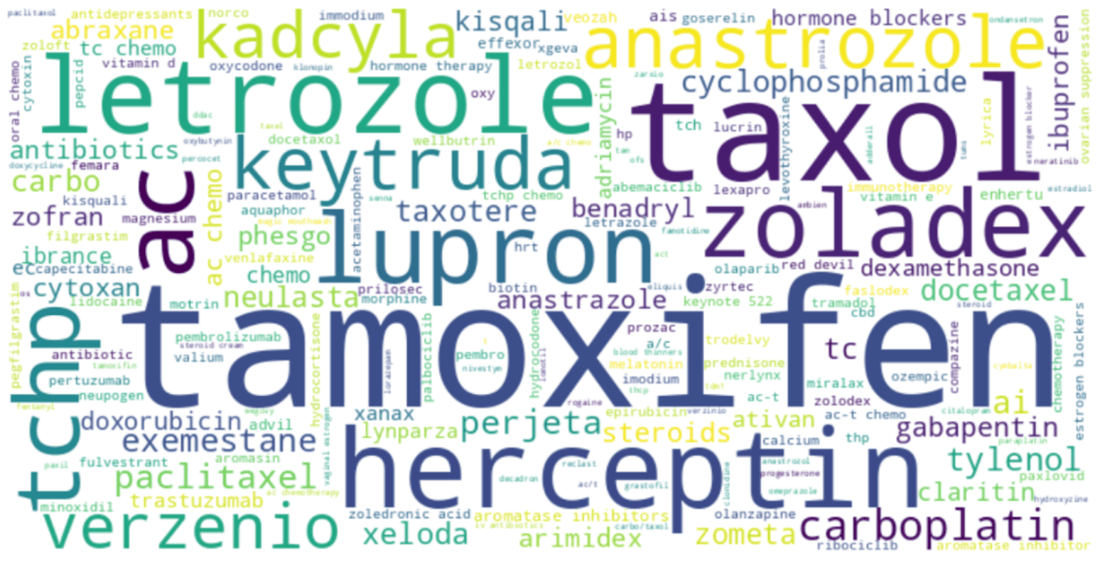 Our analysis of over 42,000 posts reveals that while 67.55% of conversations don't mention specific medications, those that do show a clear focus on the most impactful treatments. The word cloud of medications is a visual representation of this, with terms like tamoxifen, taxol, and herceptin looming large. These drugs are the subject of thousands of posts, not just for their clinical purpose but for the side effects and personal dilemmas they introduce.