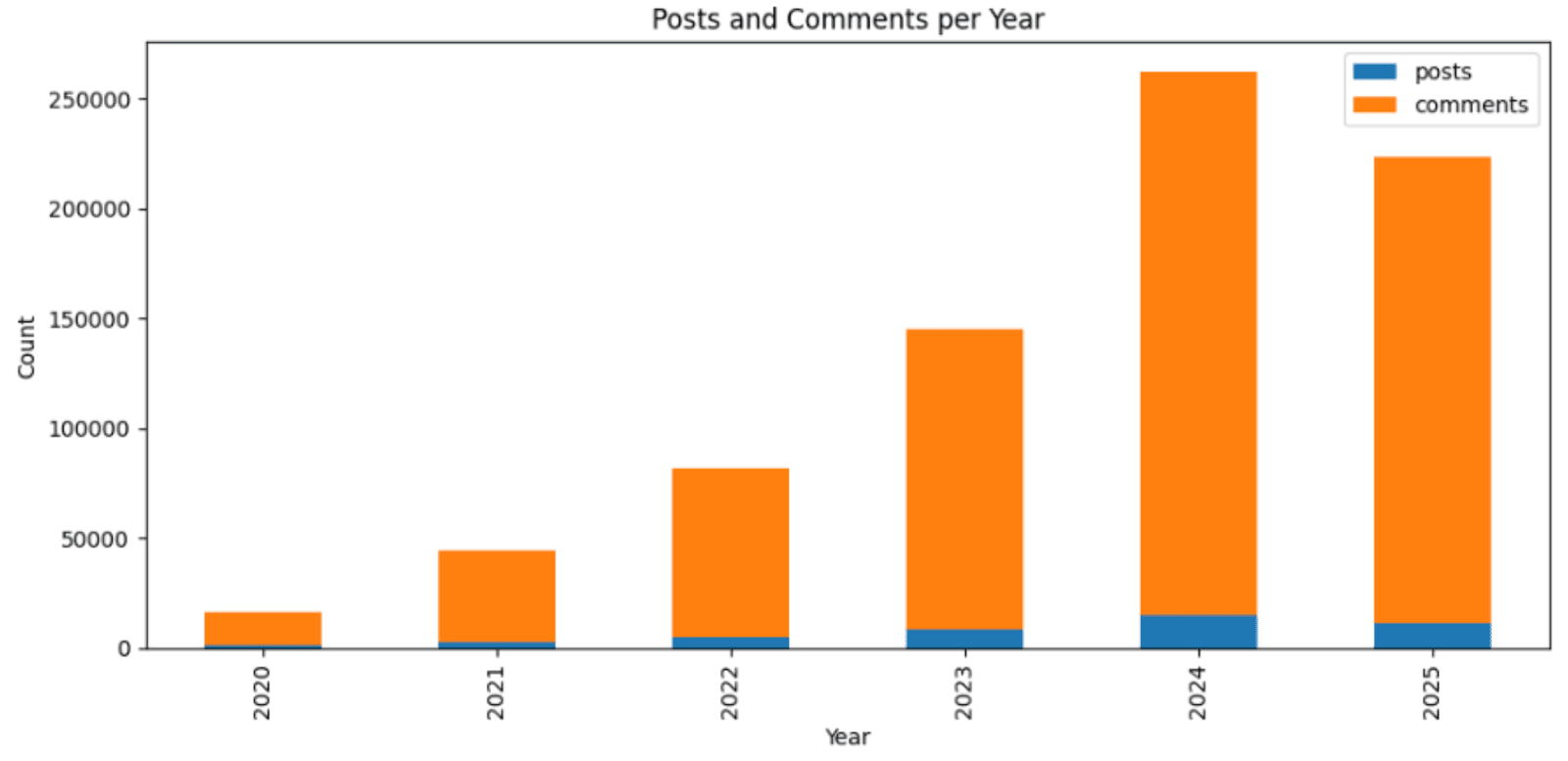 A growing community: The subreddit has more than quadrupled since 2020, with comments surging to over 250,000 in 2024.